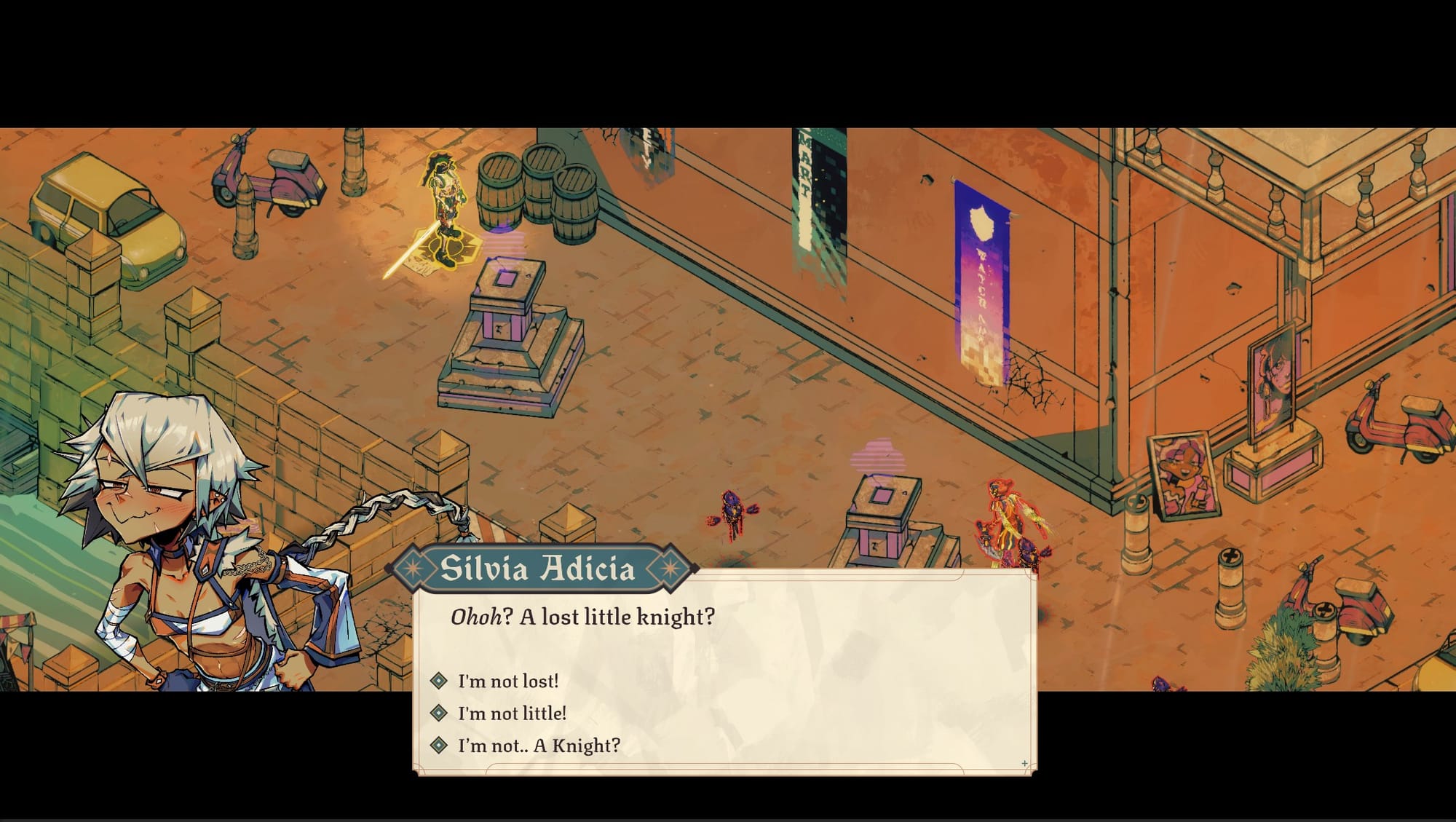 At the start of a new game, a delightfully voiced-over cinematic introduces you to the late medieval city of Neo-Talis. Your city is overrun with Chromatics, monsters resulting from a Black-Death-ish anomaly. As the new Inquisitor riding into town on your gallant steed adorable scooter, it’s your job to stop them. You'll do so by gaining favor with the three houses of Neo-Talis to empower your Inquisition army. No one expects you to succeed.